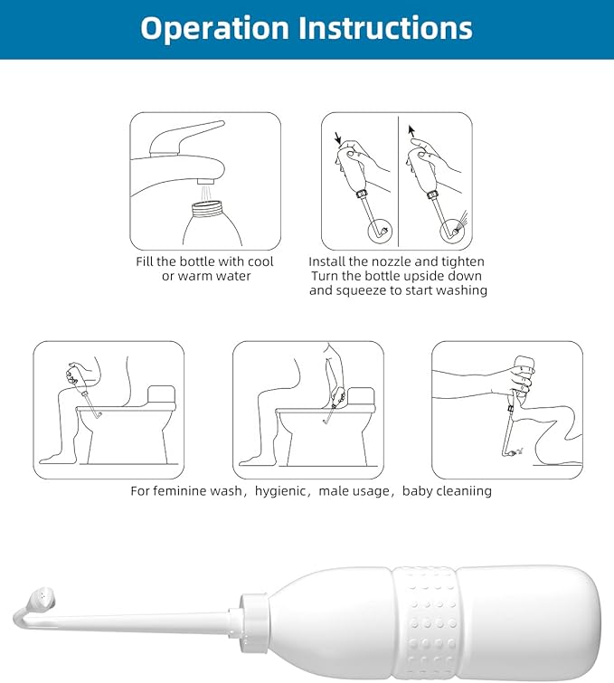 - Easy to use: No power, no battery.Simply fill with cool or warm water and squeeze bidet bottles, you will enjoy a soothing spritz of freshness in your first postnatal months,and conserve toilet papers. Suitable for when you're on the go and you want to take the benefits of a bidet with you.