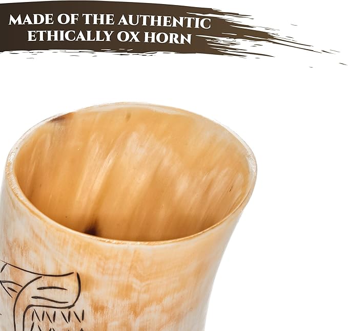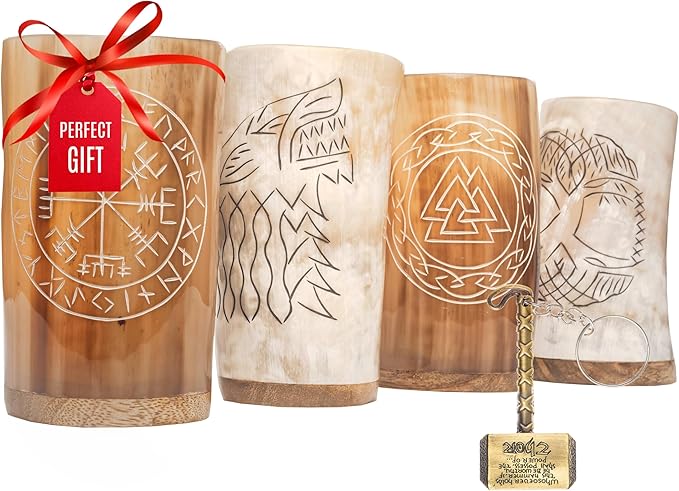 - ๐บ Exquisite Craftsmanship: Our artisans take pride in every detail, carefully carving and polishing each horn cup to perfection. The result is a set of four distinct and stunning pieces that will impress your guests and add a touch of viking lore to your home.