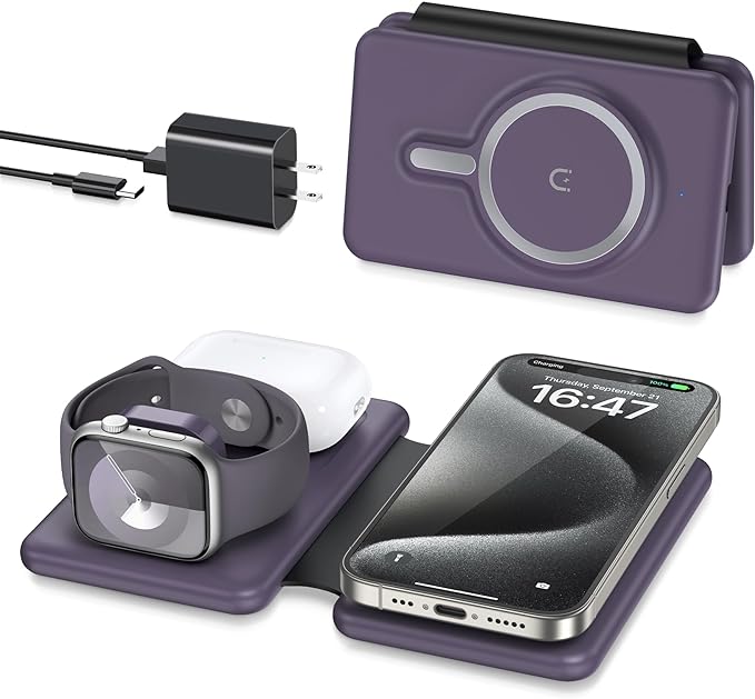 - 【The Apple charging station for multiple devices】The Magsafe travel charger is specifically designed to be compatible with Mag chargers. The magnetic suction is suitable for iPhone Air 17 16 15 14/17 16 15 14 Pro/16 15 14 Plus/17 16 15 14 Pro Max/ iPhone 13 12 /13 12 Pro/13 12 Pro Max. It is also compatible with Apple Watch 10 9 8 7 6 5 4 3 2 Ultra 2 1 & AirPods pro 4 3 2 with magsafe charging case.