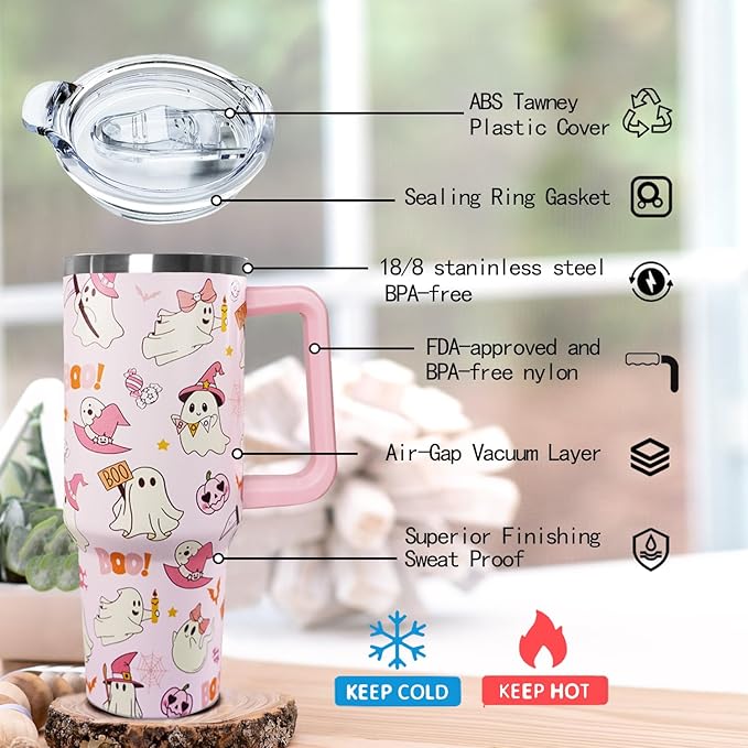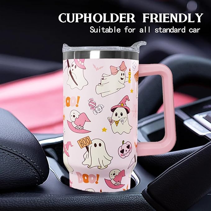 - Halloween Gifts for Women: 1 Pcs 30 oz pink boo travel mug; 1 PCS straws. Swivel cup lid,The capacity is large enough to hold all kinds of drinks, coffee, tea, milk, water and other beverage.It is not only for drinking but for party decor as well! Pair it with your halloween themed party, harvest gathering, etc