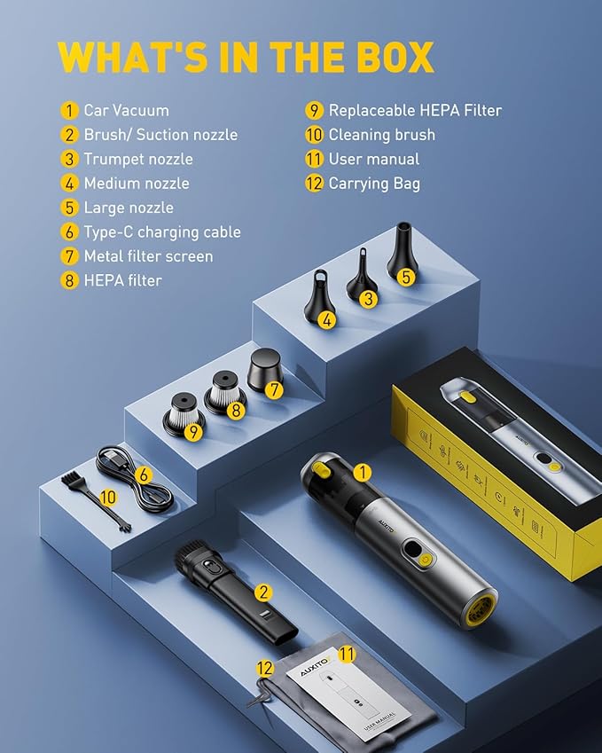 - Included Components : Car Vacuum x1, Brush/ Suction nozzle x1, Trumpet nozzle x1, Medium nozzle x1, Large nozzle x1, Type-C charging cable x1, Metal filter screen x1, HEPA filter x1, Replaceable HEPA Filter x1, Cleaning brush x1, User manual x1, Carrying Bag x1 Car Vacuum x1, Brush/ Suction nozzle x1, Trumpet nozzle x1, Medium nozzle x1, Large nozzle x1, Type-C charging cable x1, Metal… See more