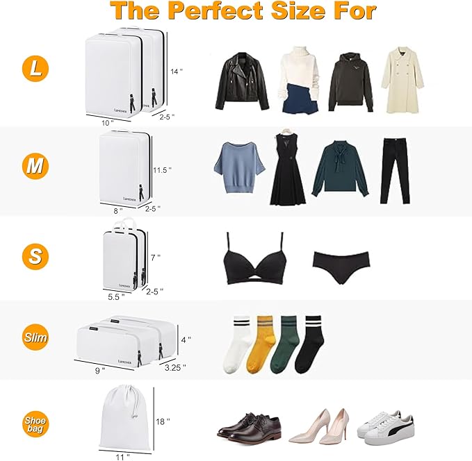 - 🎒8-Piece Ultimate Packing Cube Set – Organize Like a Pro:The Velaybor travel organizer set includes 7 compression packing cubes (2 XL / 1 L / 2 M / 2 accessory pouches) and 1 waterproof drawstring shoe bag, ensuring effortless packing for clothes, shoes, toiletries, and accessories. Ideal for short getaways, long vacations, business trips, road trips, and cruises, keeping your suitcase tidy and organized!