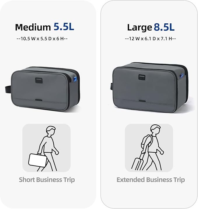 - EXTRA LARGE CAPACIT: 12 x 6.1 x 7.1 inches. Meet all the storage needs of full-size toiletries or shaving supplies, and the bottles can stand upright in it. Multiple pockets inside keep all personal items beautifully organized