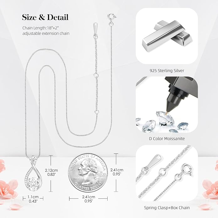 1.5CT Moissanite Infinity Pendant Necklace Anniversary Wedding Gifts for Women Wife Her S925 Sterling Silver 18K White Gold/Gold Filled Jewelry for Birthday Mothers Christmas Valentines Day