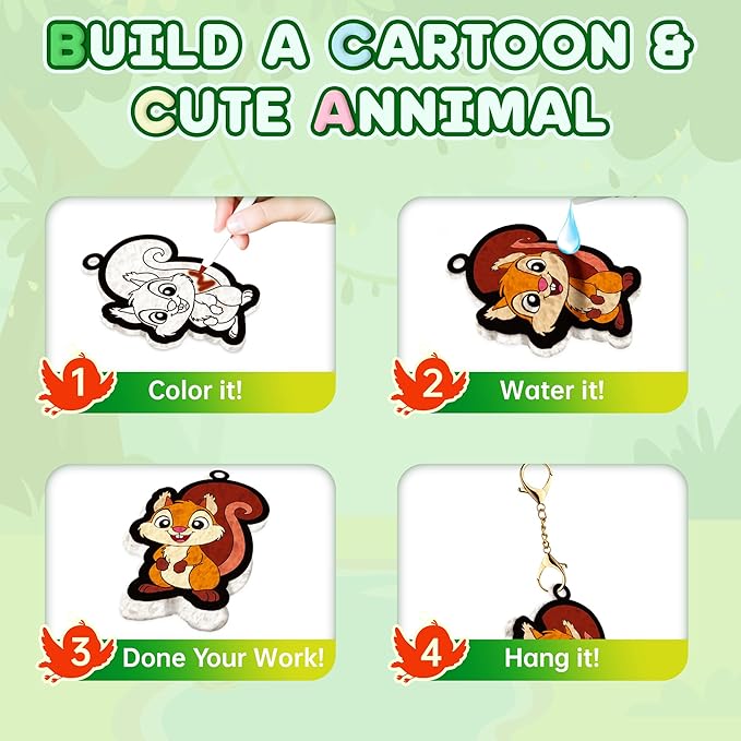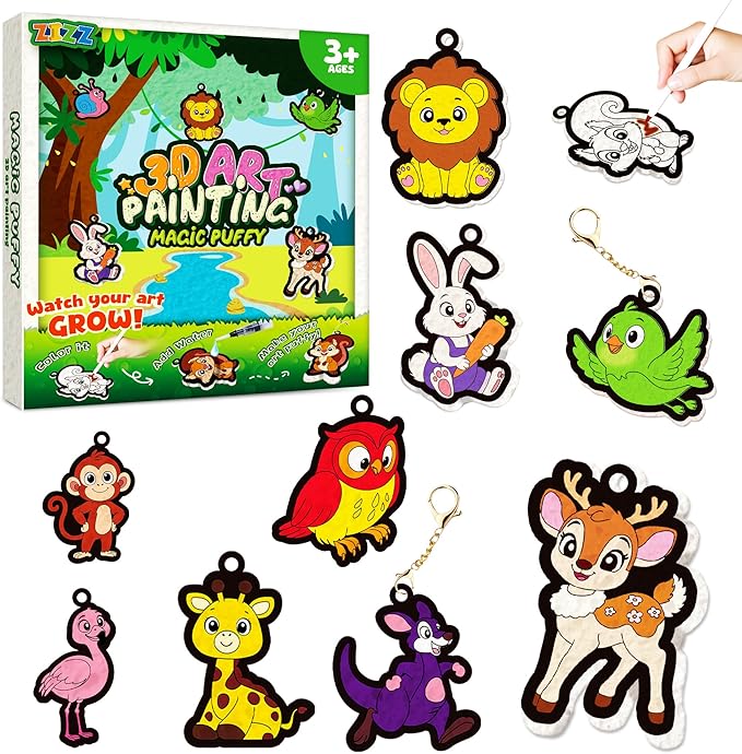 - 3D Art That Magically Comes Alive: Dive into fun animal-themed 3D art craft—color the cute animal designs first, then add water, and watch your creations puff up magically! Once dried, thread string or a keychain through the built-in hole to turn them into charming room decor or cool accessories. It’s a delightful way for girls to see their art come to life.
