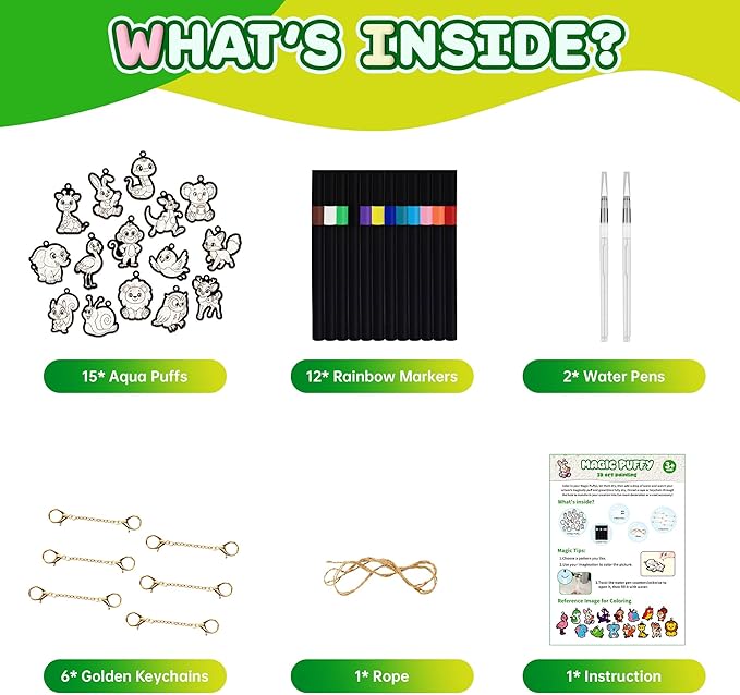 - All-Inclusive Art Kit for Instant Fun: This Aqua Puffs art kit has everything you need to start crafting right away: 15 Aqua Puffs, 12 markers, 2 water pens, 6 keychains, string, and a clear instruction manual. No extra supplies required—unbox and create!