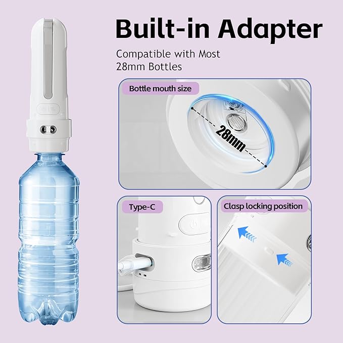 - Universal Compatibility & IPX7 Waterproof Safety: Use the included cup 6.4 fl oz (US) or attach the bidet to standard 28mm PCO 1810 beverage bottles for flexible water capacity. With IPX7 waterproof rating, the entire device is safe to rinse and clean. Plus, the automatic dry-run prevention stops operation within 1–2 seconds if water is low, protecting the motor.