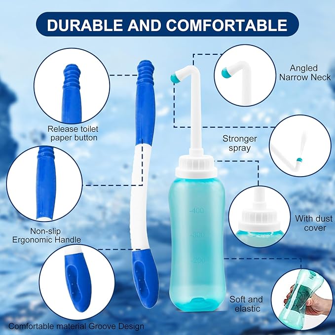 - Fresh Comfort Anywhere: Stay clean and confident wherever life takes you—this toilet aids for wiping bottom set combines a peri bottle and a foldable butt wiper tool for women, giving full hygiene care at home, during travel, or while recovering