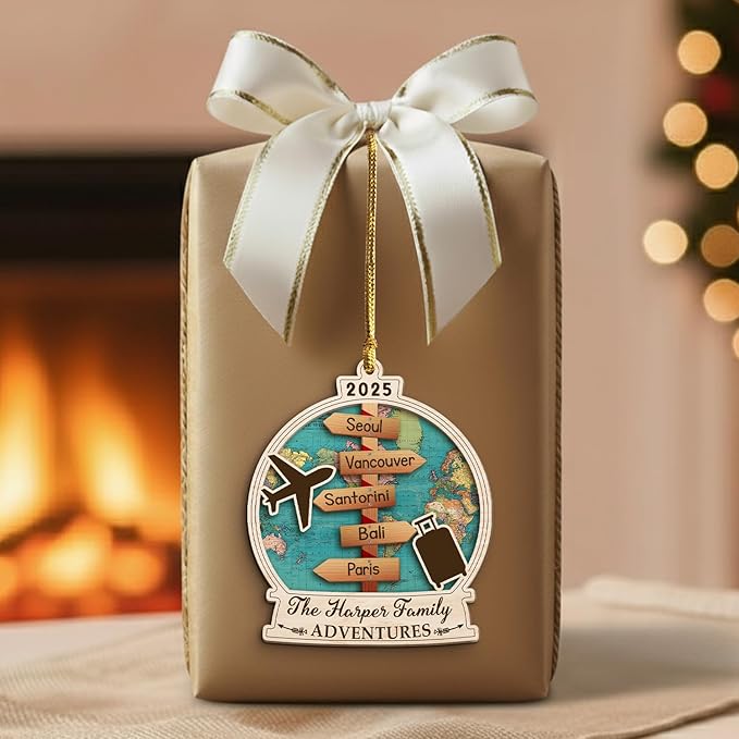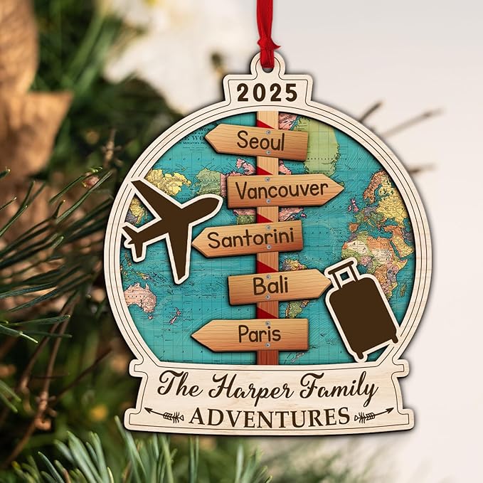 - CUSTOM TRAVEL ORNAMENT 2025 – Personalize with your chosen destinations and family name to create a unique keepsake that celebrates your travel memories.